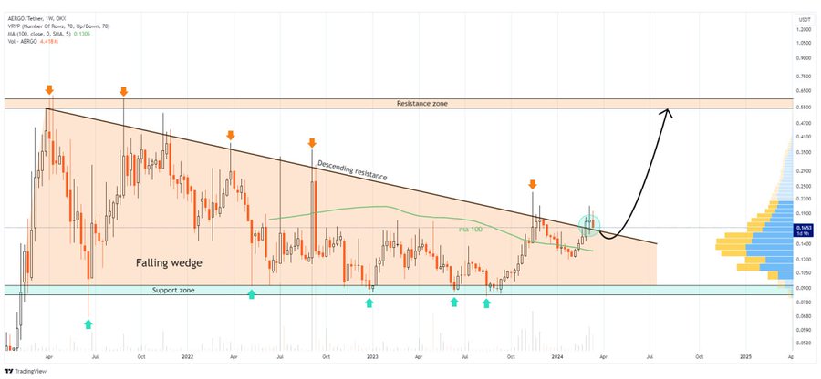 A falling wedge breakout for $AERGO has been confirmed on the weekly timeframe💥A bullish wave of around 150% is anticipated…